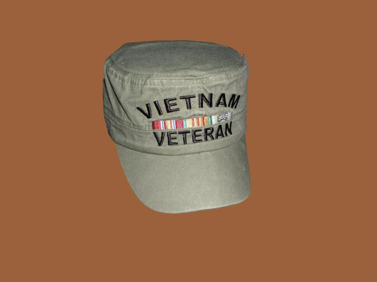 U.S MILITARY VIETNAM VETERAN HAT FLAT TOP OD GREEN BALL CAP VIETNAM RIBBONS
