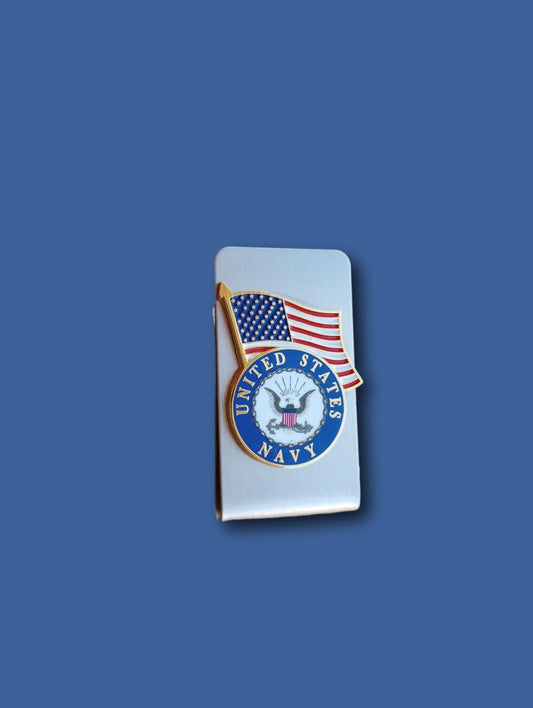 MILITARY NAVY INSIGNIA CREST U.S.A FLAG STAINLESS STEEL MONEY CLIP U.S.A MADE