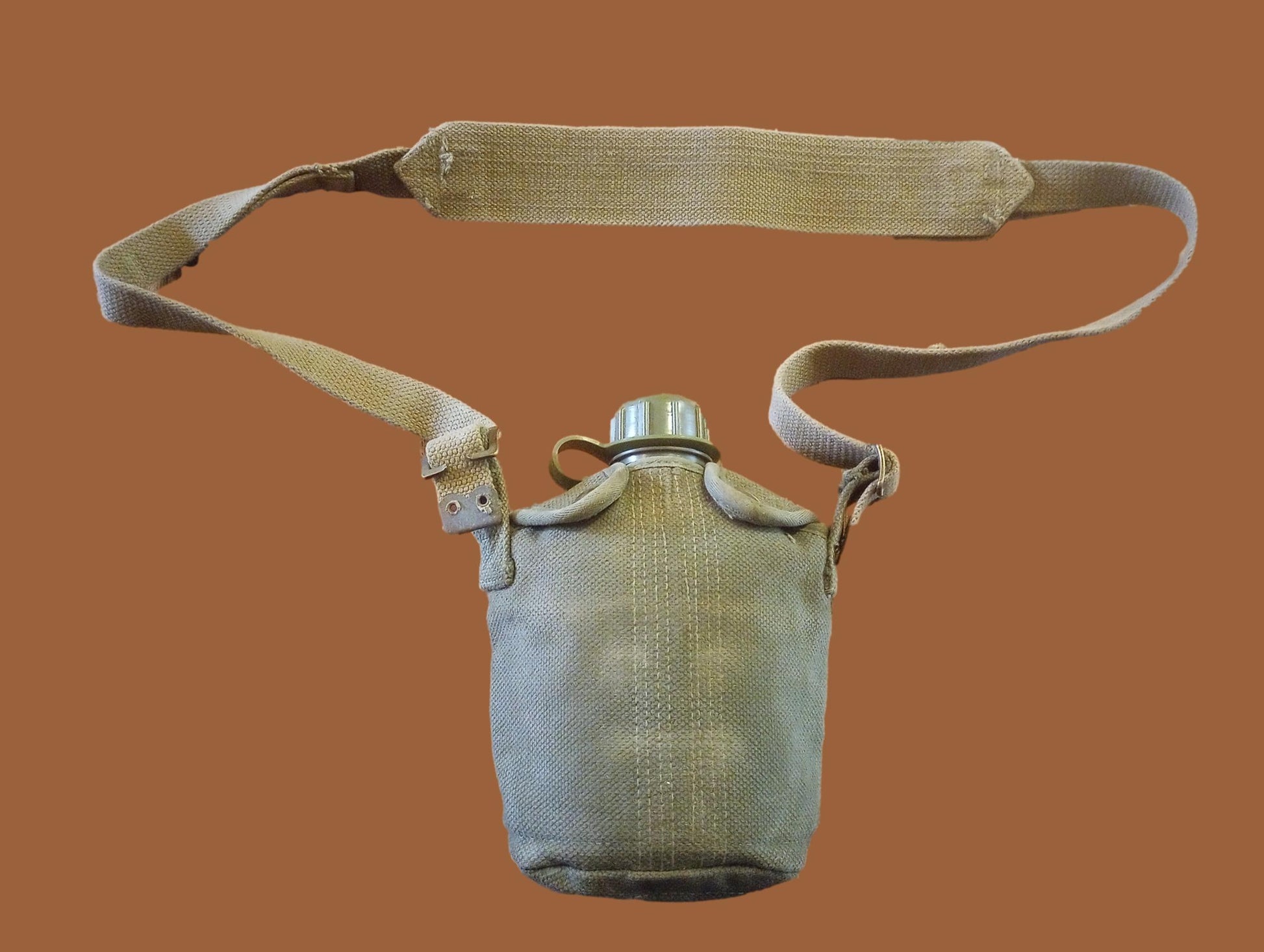 Belgian canteen and shoulder strap. Vintage cover is od green in color made of heavy duty cotton canvas material with two brass closure snaps wool blend pyle lined. Covers are 1950's 1960's vintage British made. Straps are P-37 Pattern British made and are 1940's -1950's vintage khaki in color. Canteens are new hdpe plastic 1 quart capacity modern era never used.