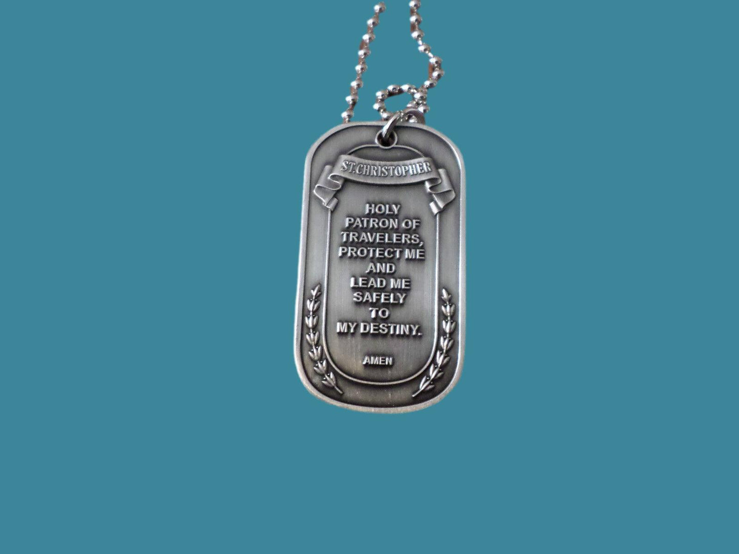 Beyond its beautiful antique silver finish, the pendant comes with a 12 1/2" inch chain, making it a versatile accessory for daily wear or special occasions. A key feature of this necklace is the prayer inscribed on the back, offering blessings and protection for safe travel. This feature underscores the pendant’s role not just as an adornment but also as a talisman of faith and guidance. Whether you're seeking a gift for a loved one or a personal emblem of protection, this St. Christopher Dog Tag embodies strength, guidance, and the spirit of safe travels.