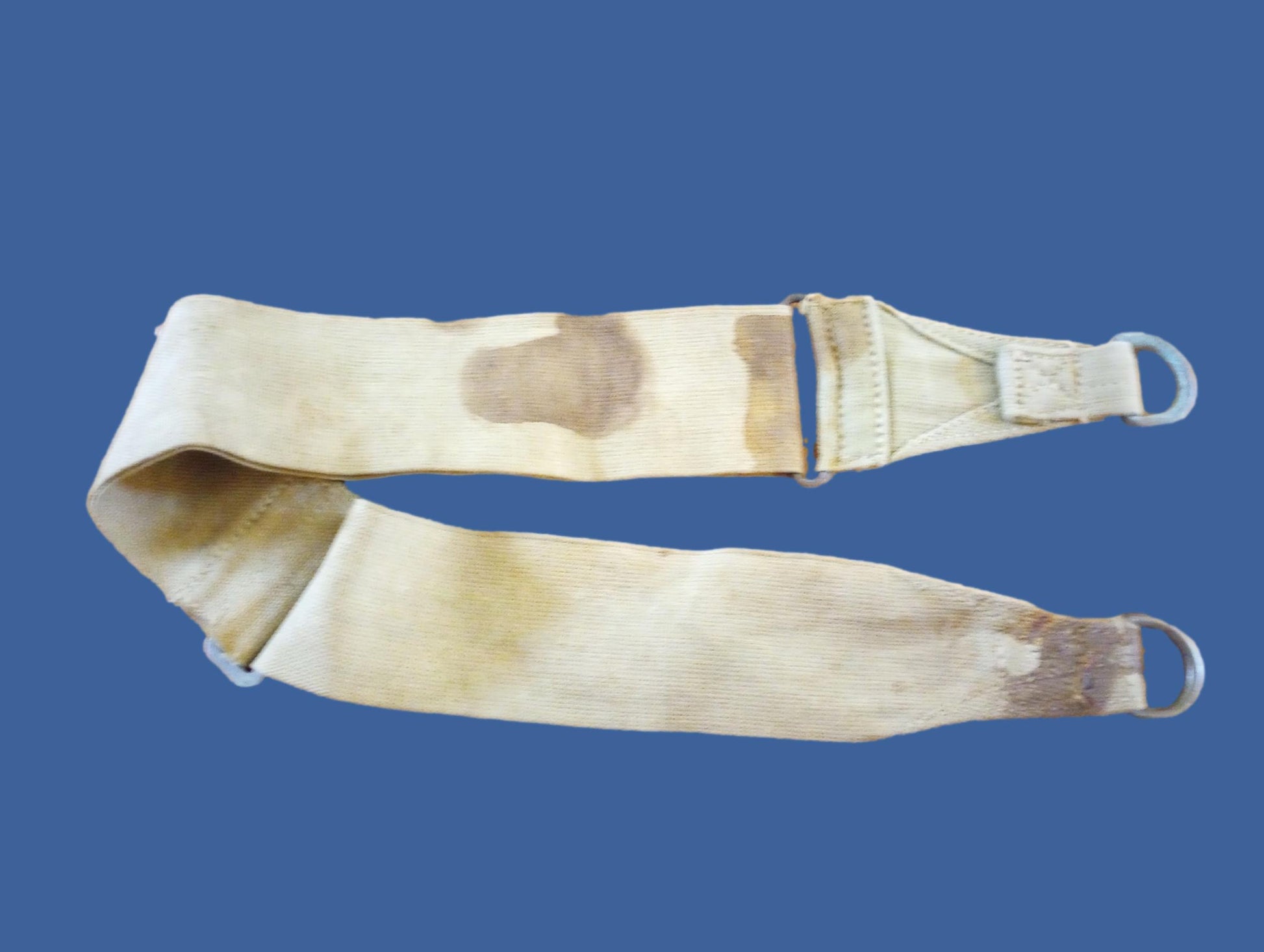 The musette strap features an adjustable design, with a length that can be extended up to 31 inches and a width of 2 inches, ensuring a versatile fit for various carrying needs. The metal hardware, including a black buckle and D rings, adds to the strap's authenticity, albeit with slight signs of age that only enhance its historical value. As a genuine piece from the United States, it carries with it the stories and experiences of a bygone era. Whether for reenactment, display, or personal appreciation, this musette strap serves as a connection to the past, perfect for anyone who values military history and artifacts.