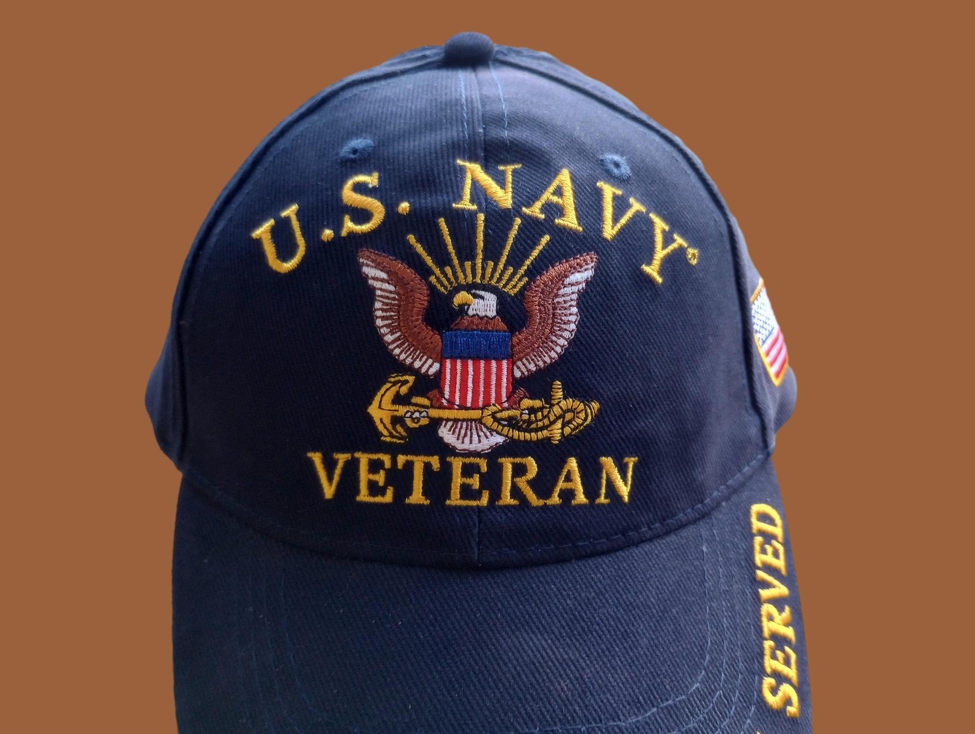 Celebrate the distinguished legacy of service and commitment with the Eagle U.S. Navy Veteran Cap. Meticulously designed, this dark navy blue cap embodies the honored tradition of the U.S. Navy Veterans. Featuring "Navy Veteran" emblazoned on the front, "Proudly Served" on the bill, and a repeat of "United States Navy Veteran" on the back, this cap is a powerful statement of pride for those who have served. Crafted from 100% cotton twill, the cap ensures durability, breathability, and supreme comfort throughout the day.