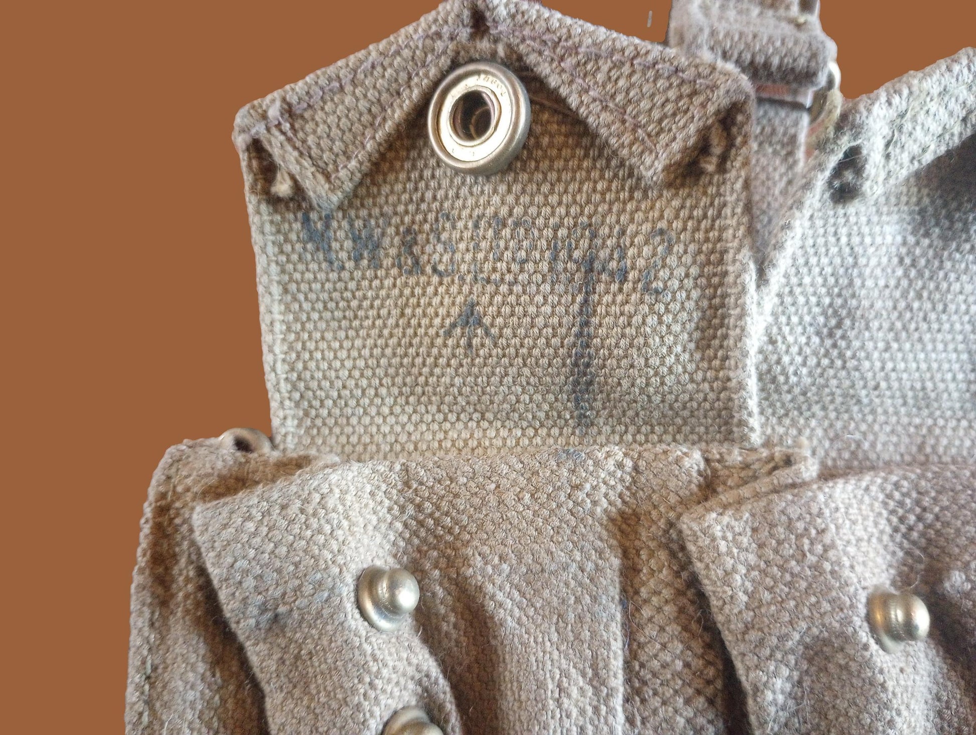 Introducing a genuine piece of World War II history - the British Military P-37 pattern ammo pouch, specifically designed for the Enfield Rifle. Made by Michael Wright & Sons in 1942, this pouch marked with the iconic broad arrow symbolizes authenticity and quality. The khaki-colored canvas, combined with durable brass hardware, not only reflects the era's manufacturing excellence but also provides a durable solution for carrying ammunition.