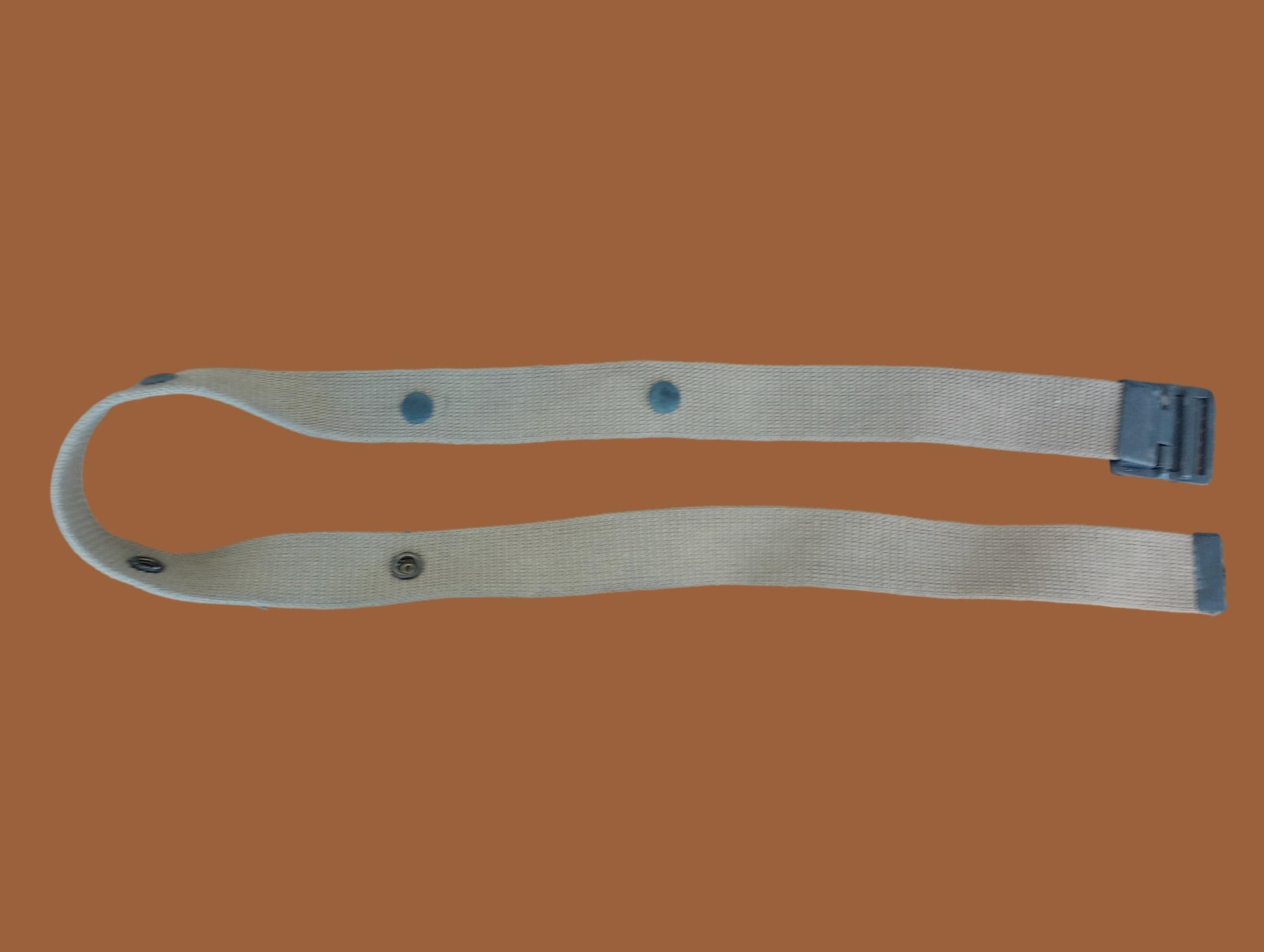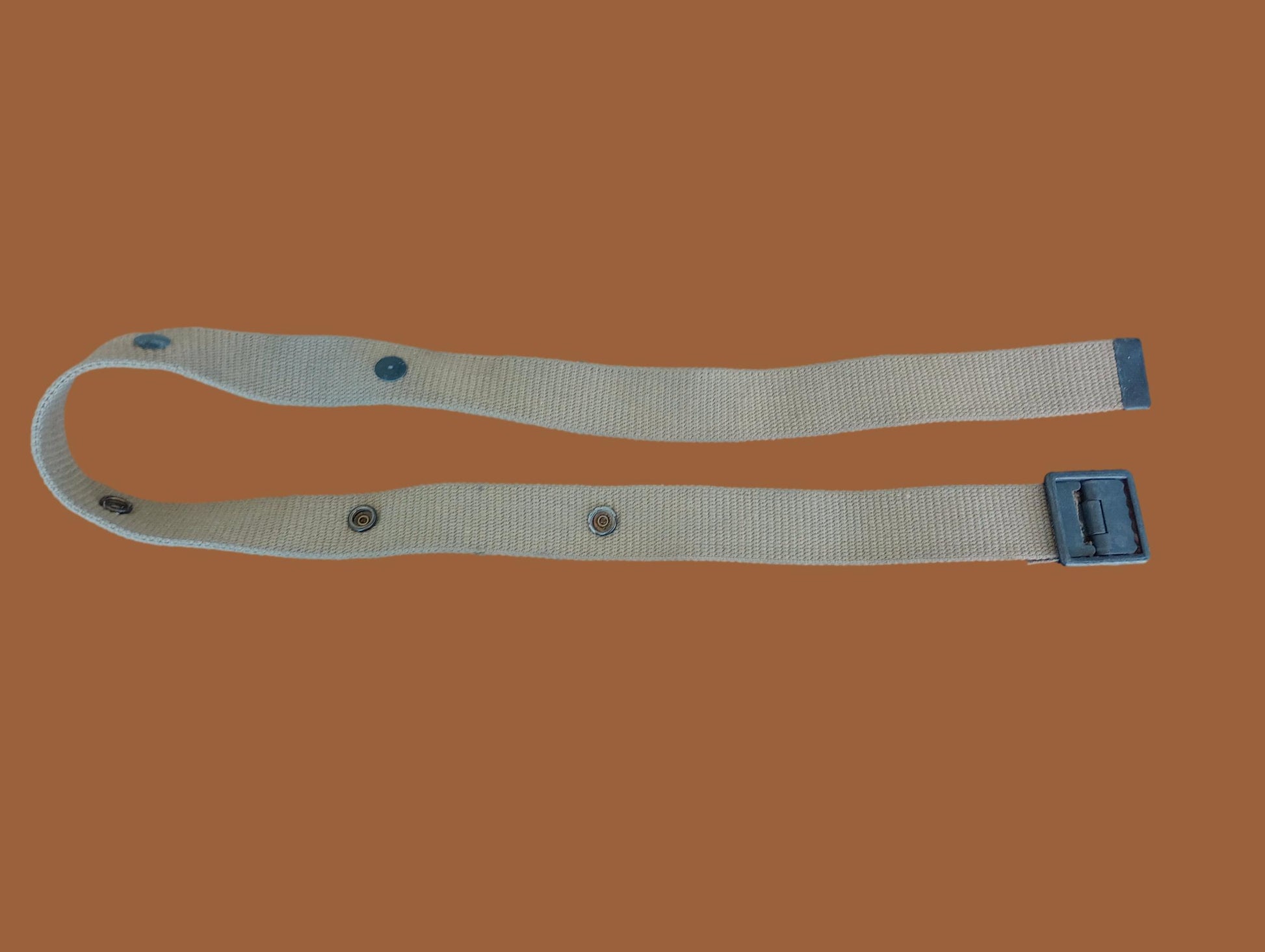 Featuring a robust khaki strap complemented by an open face buckle, the belt measures an impressive 42 inches in length and 1 3/8 inches in width. Its versatility is shown through the integration of five durable snaps, designed to secure demolition pouches or the 20 round M-1 carbine pouches effortlessly. The historical authenticity of this belt is further emphasized by its non-modification status, ensuring you receive a piece of history as it was meant to be preserved. Coupled with the subtle patina on its brass snaps, this belt is not only a functional accessory but also a tribute to the valor and sacrifices of the U.S. Marine Corps during World War II.